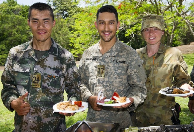 午饭时间到,我们来一组在澳大利亚举行的中美澳三军联合野外生存训练的让人羡慕的照片。图中三军士兵野外垂钓收获巨大,野餐会食品丰富,巴掌大的虾管够吃,就算是最艰苦的也是个悠闲的烧烤活!军迷戏称,这可真是最休闲的军演了!