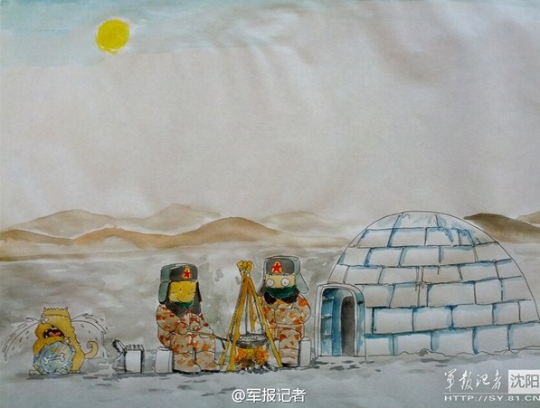 边防战士往往驻扎在气候条件极端的区域,为表现这一点,战士画出了爱斯基摩人的雪屋,军犬骨头都冻成了棒冰。
