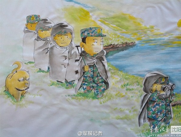 穿着雨衣巡逻的边防战士,前面的尖兵正在观察望远镜,同样也有一只军犬。