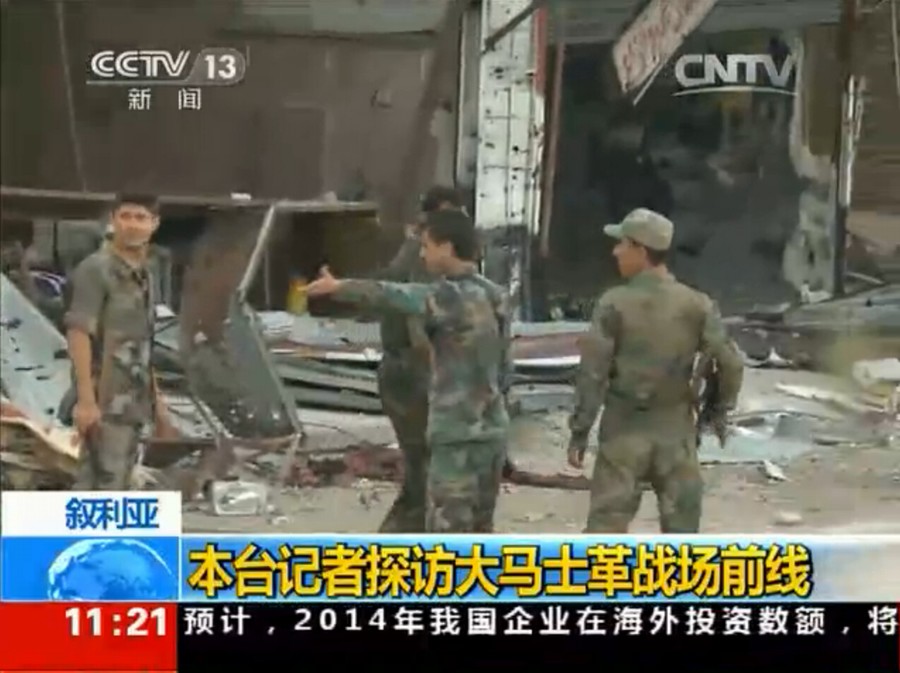 叙利亚政府军士兵为央视记者“开道”确保安全