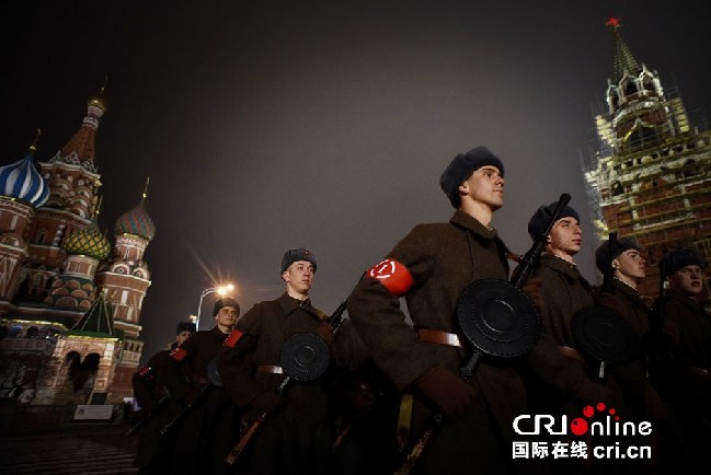 当地时间2014年11月5日,俄罗斯莫斯科,俄罗斯军人穿着二战时期的历史制服参加军事游行彩排。11月7日俄罗斯将举行纪念1941年苏联士兵在红场游行奔向二战前线。