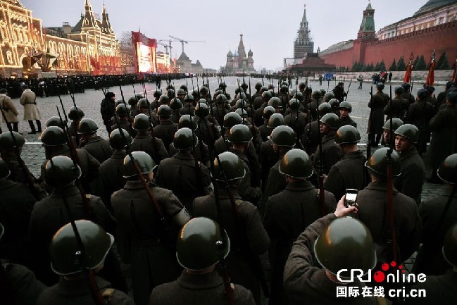 当地时间2014年11月5日,俄罗斯莫斯科,俄罗斯军人穿着二战时期的历史制服参加军事游行彩排。11月7日俄罗斯将举行纪念1941年苏联士兵在红场游行奔向二战前线。