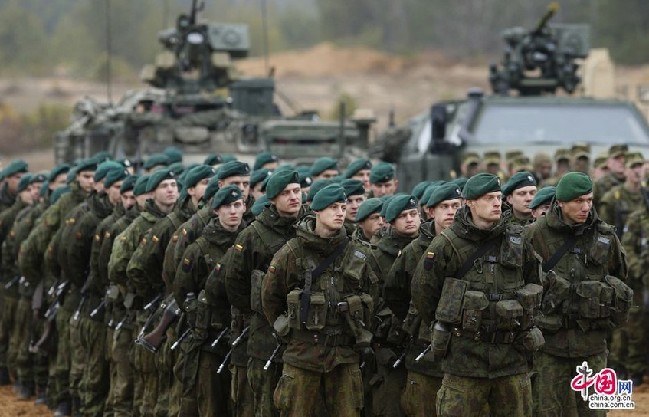 当地时间2014年11月13日,立陶宛Pabrade,立陶宛士兵参加在当地举行“铁剑2014”多国军事演习。此次演习共有超过2500名来自9个北约成员国的士兵参加。
