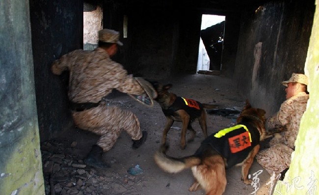 解放军特种部队训练军犬炸碉堡,十余名学员经历7个月严格淘汰,先后完成了军犬管理基础知识、抵近侦察、循迹追踪、探测排雷、目标爆破等28个课目的学习训练。