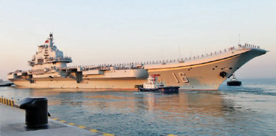 第1步:拖船牵引,三艘小拖船牵引航母转弯,将航母推进码头。本版图片由逄忠平 摄