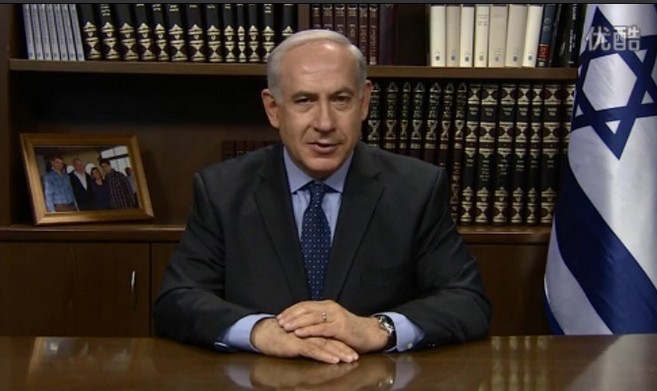 以色列总理内塔尼亚胡发表新年贺词时,能看出背景书柜上有很多犹太经典书籍。