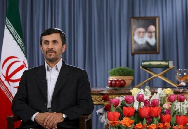 伊朗前总统内贾德在办公室发表新年贺词的资料图。桌子上摆放着古兰经,幕布上挂着最高领袖像。