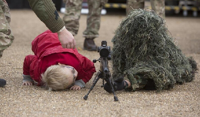 当地时间2013年10月25日,英国伦敦,预备役部队新兵招募活动上,6岁的Reese趴在地上偷看穿“伪装服”的士兵。