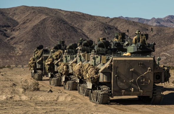 2015年2月15日,美国海军第三海军陆战队远征部队,第3陆战师,第3陆战团,第2营士兵正在进行实战演练。参演部队动用了包括M1A1主战坦克、重型清障车、AAV7两栖战车等威力强大的陆战武器。在空中运输方面,陆战队动用了CH-53E超级种马重型直升机。