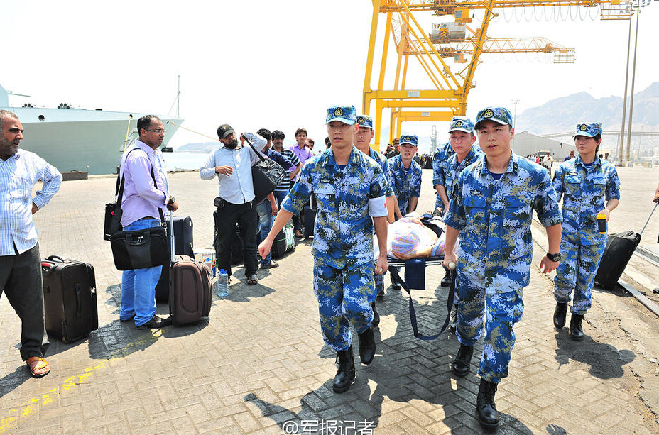 中国海军协助外国侨民撤离也门。因为当地动荡,饮食与医疗没有保障,外国侨民中有两人身体已十分虚弱,我军战士将其用担架抬到战舰上进行治疗。