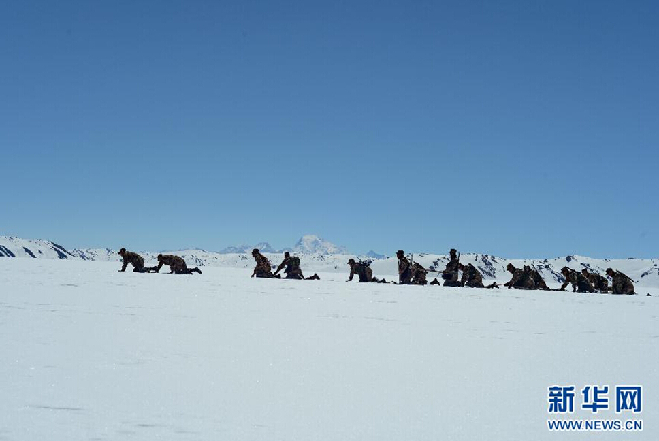 4月10日,西藏阿里军分区西兰塔边防连巡逻分队官兵采用爬行方式在海拔5659米的马香山口巡逻。四月以来,阿里高原冰雪初融,天气逐渐转暖,西藏阿里军分区所属部队加大了对边境地区重点地段的管控力度。位于喜马拉雅山北麓的西兰塔边防连采取徒步与乘马相结合的方式,在1米多厚的积雪中挖雪开道,有时还爬行着前往执勤点,确保了边境地区的安宁。新华社发(向文军摄)