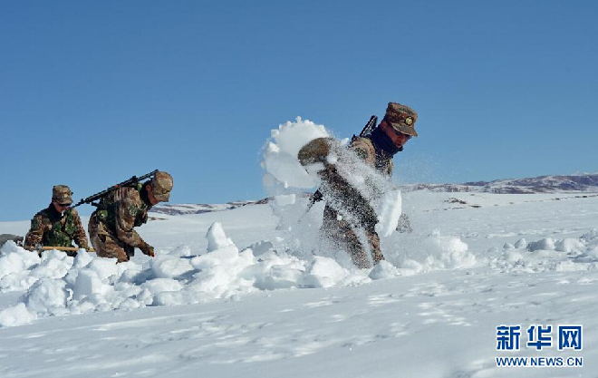 4月10日,西藏阿里军分区西兰塔边防连巡逻分队官兵巡逻路上挖雪开道。四月以来,阿里高原冰雪初融,天气逐渐转暖,西藏阿里军分区所属部队加大了对边境地区重点地段的管控力度。位于喜马拉雅山北麓的西兰塔边防连采取徒步与乘马相结合的方式,在1米多厚的积雪中挖雪开道,有时还爬行着前往执勤点,确保了边境地区的安宁。新华社发(向文军摄)