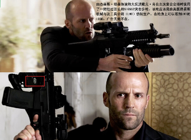 由杰森斯·坦森饰演的大反派戴克·肖在血洗宴会会场时使用了一把经过改装的SIG552突击步枪。该枪应该是由美国路易斯机械与及工具公司(LMT)仿制生产,在枪身上可以看到LMT的LOGO,广告无处不在。