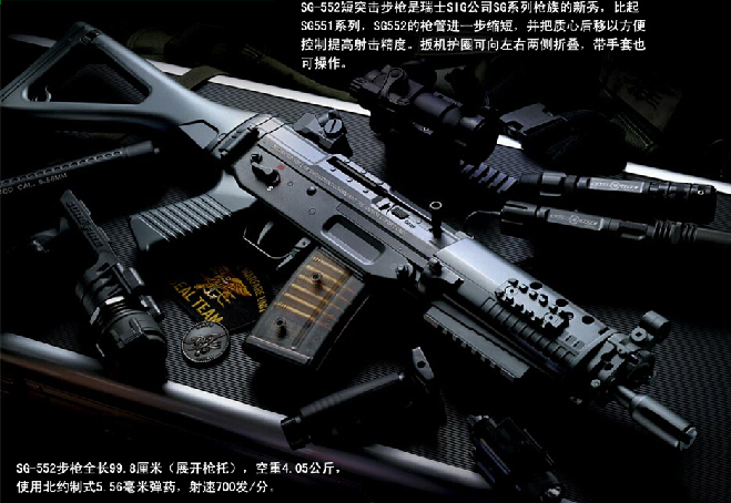 SG-552短突击步枪是瑞士SIG公司SG系列枪族的新秀,比起SG551系列,SG552的枪管进一步缩短,并把质心后移以方便控制提高射击精度。扳机护圈可向左右两侧折叠,带手套也可操作。