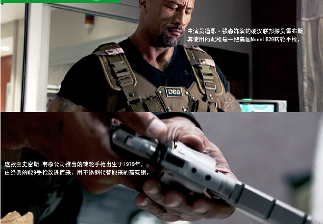 由演员道恩·强森饰演的硬汉联邦探员霍布斯,其使用的配枪是一把美国Model629转轮手枪。