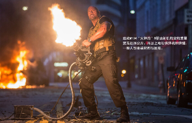 电影中重伤入院美国联邦探员霍布斯,强忍病痛出院支援好友托雷托,在开车撞毁一架无人机后直接捡起战机装备的转管机枪继续战斗,其威风不输当年史泰龙。