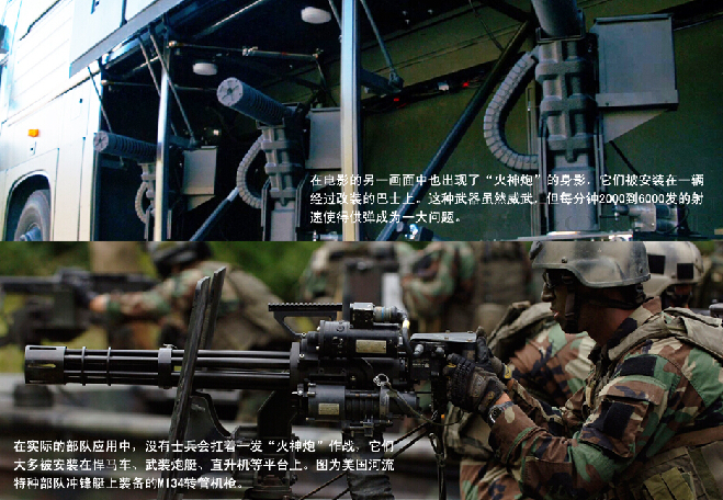 在电影的另一画面中也出现了“火神炮”的身影,它们被安装在一辆经过改装的巴士上。这种武器虽然威武,但每分钟2000到6000发的射速使得供弹成为一大问题。