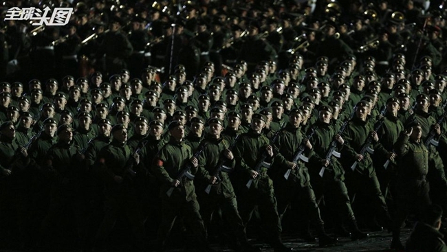 当地时间2015年5月5日,俄罗斯莫斯科,俄罗斯纪念卫国战争胜利70周年阅兵式的二次彩排。俄方将首次展示最新“顶级”武器系统,如RS—24型“亚尔斯”洲际导弹和最新一代主战坦克阿尔玛塔T-14。俄军新型装甲运兵车、高精度火炮、苏-30和苏-35战机也将首次亮相红场阅兵。
