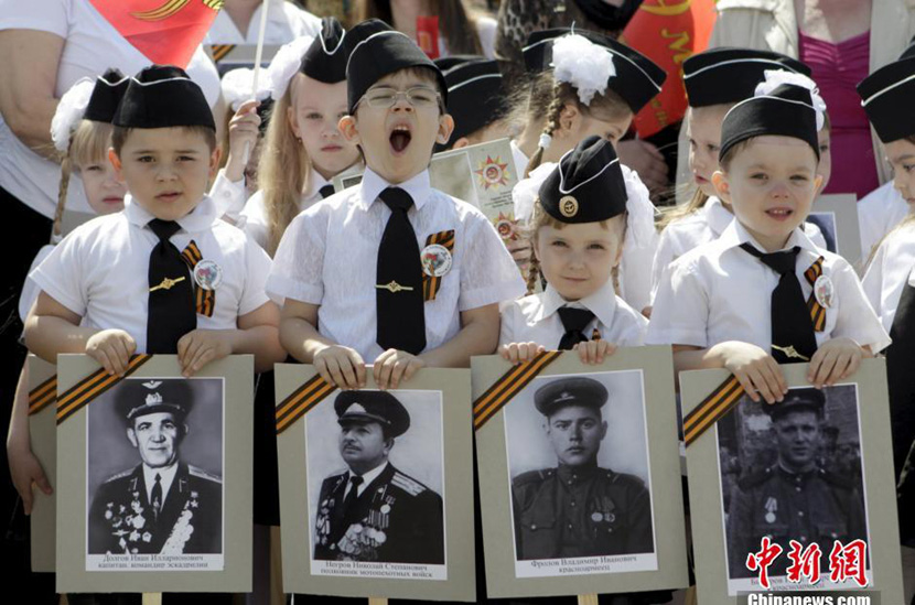 当地时间2015年5月14日,俄罗斯罗斯托夫,儿童们穿着军装参加游行,纪念卫国战争胜利70周年。约500名4岁至10岁的儿童参加。