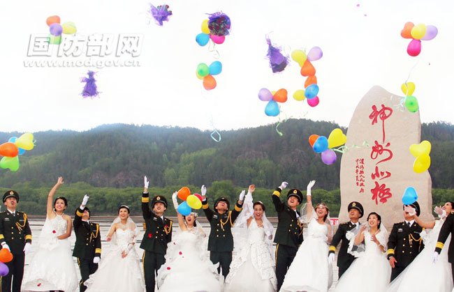 6月6日上午,驻守在祖国最北端漠河县的沈阳军区某边防团举办了首次军营集体婚礼,10对新人的绿戎装和白婚纱,就是这场婚礼最亮丽的风景线。