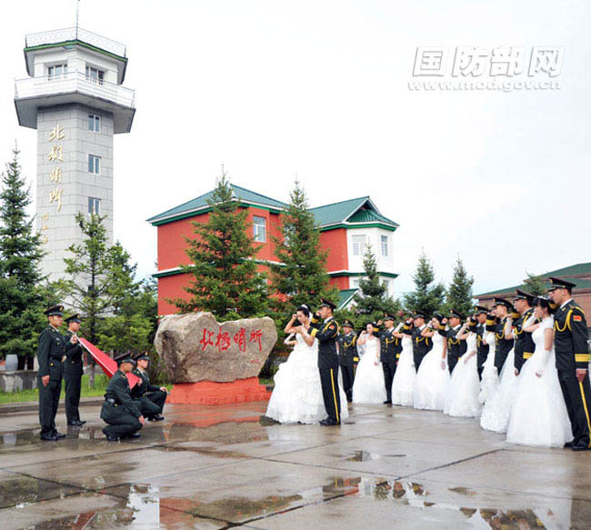 典礼结束后,10对新人纷纷奔赴素有“中国北极”之称的北极村。在美丽的黑龙江畔,蓝天白云的见证下,他们漫步北极沙洲,在神州北极石前放飞了自己梦想。在北极哨所前相互交换了定情信物,在北极哨兵雕像前,10对新人面对军旗庄严宣誓。随后,10对新人分成两组感受丈夫的巡逻路。面对界江高声呼喊:“花开烂漫点赞北极军旅良缘、同心报国助力强军目标实现”。