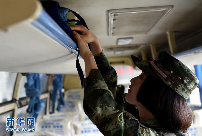 张绺在一辆大巴车上检查是否有违禁品。 新华社记者 蔺以光 摄