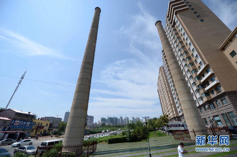 图为“七三一”部队弹壳厂遗址内当年的两根烟囱(8月3日摄)。 新华社记者王凯摄