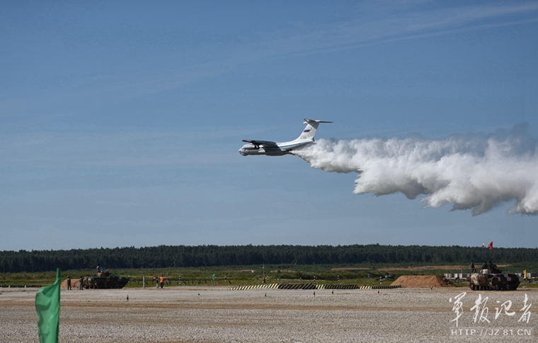 赛事主办方出动军用运输给赛场洒水降尘。梁蓬飞摄