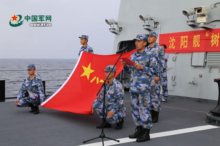 导弹驱逐舰沈阳舰对空作战部门区队长舒令代表舰员表态发言。