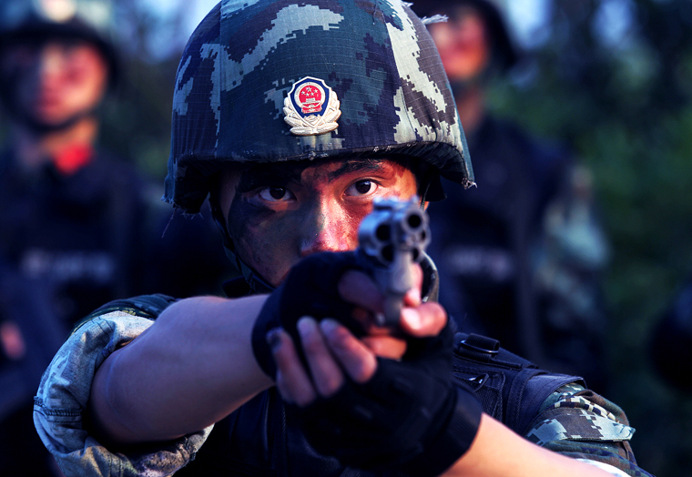 9月21日,武警狙击手何成进行手枪速射练习。