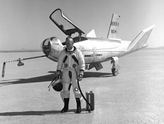 杰罗德·格特里少校站在HL-10飞机前面,这款飞机是航空航天器研制计划的一部分。这种设计提高了飞机的空气动力学性能。