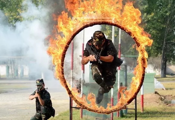协同穿越火圈是对特战队员心理的考验,也需要很熟练的技巧。