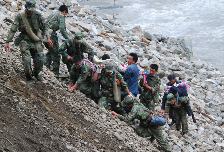 陆军第54集团军某红军师官兵在汶川地震灾区运送受灾群众(2008年6月26日摄)。 新华社发