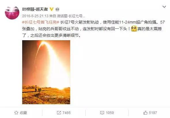2016年6月25日20时00分,我国载人航天工程为发射货运飞船而全新研制的长征七号运载火箭在海南文昌航天发射场点火升空。21时13分,新浪微博用户@叶梓颐-巡天者发出一条微博:“长征7号火箭发射轨迹,使用佳能11-24mm超广角拍摄。57张叠加,站岗的兵哥哥纹丝不动,连发射时都没有回一下头!真的是太震撼了,之后还会放出更多清晰细节。”