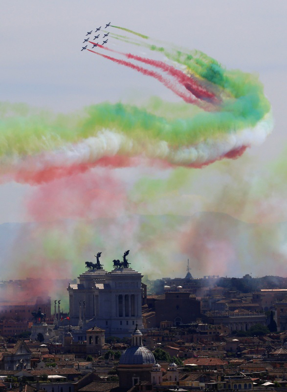 6月2日,在意大利罗马,特技飞行队在空中拉出代表意大利国旗颜色的红白绿三色烟雾,庆祝意大利共和国成立71周年。