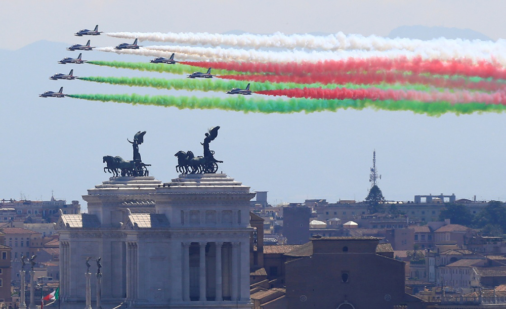 6月2日,在意大利罗马,特技飞行队在空中拉出代表意大利国旗颜色的红白绿三色烟雾,庆祝意大利共和国成立71周年。