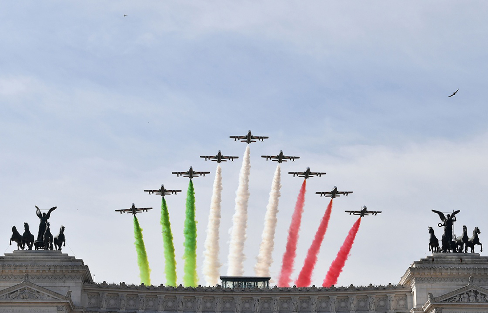 6月2日,在意大利罗马,特技飞行队在空中拉出代表意大利国旗颜色的红白绿三色烟雾,庆祝意大利共和国成立71周年。