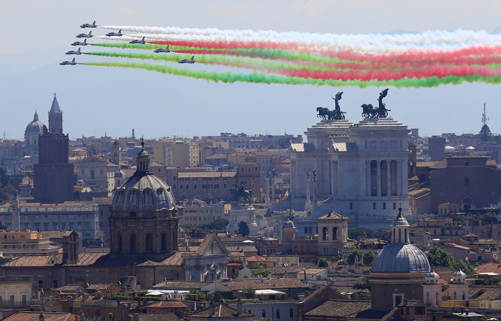 6月2日,在意大利罗马,特技飞行队在空中拉出代表意大利国旗颜色的红白绿三色烟雾,庆祝意大利共和国成立71周年。