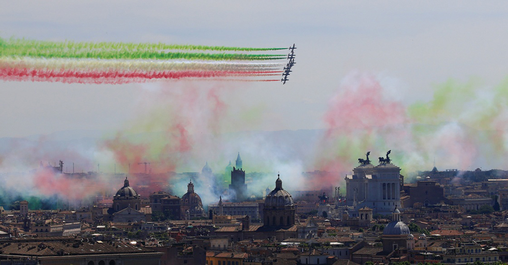 6月2日,在意大利罗马,特技飞行队在空中拉出代表意大利国旗颜色的红白绿三色烟雾,庆祝意大利共和国成立71周年。