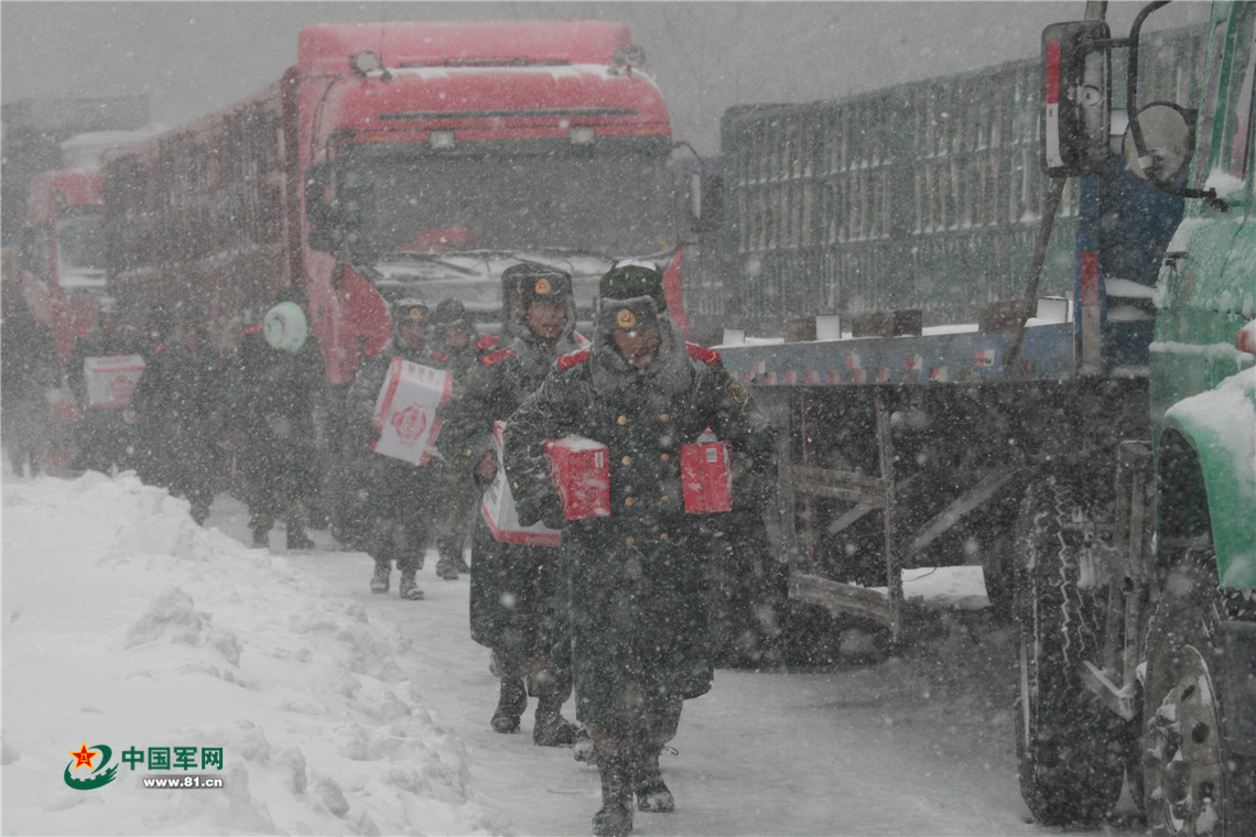 官兵冒雪为受困群众运送救援物资。李光印 摄