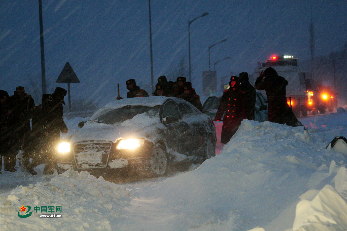 武警北京总队出动600余名官兵第一时间顶风冒雪奔赴八达岭清扫积雪。李光印 摄