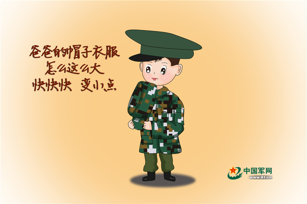 我最喜欢穿爸爸的军装,戴爸爸的帽子。“瞧!我也有了军人模样!”