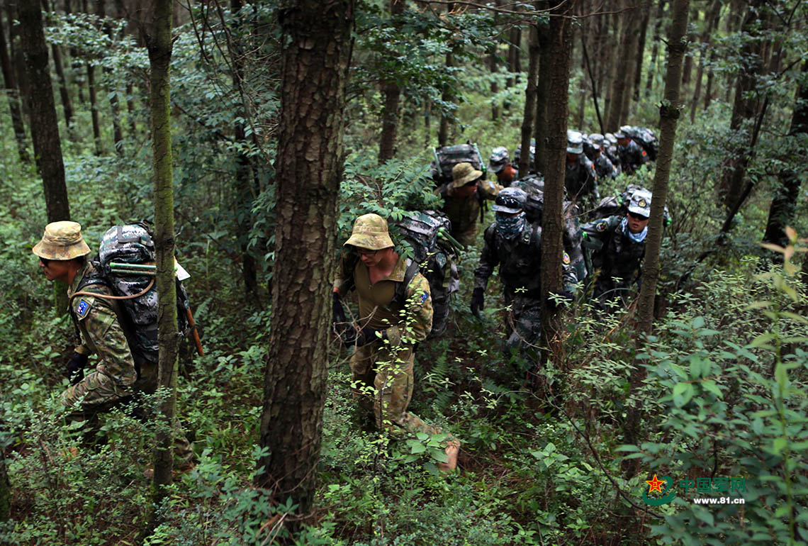2017年9月10日至20日,“熊猫袋鼠-2017”中澳陆军联合训练在南部战区陆军昆明某综合训练场举行。这是双方队员穿越丛林时的情景。阳吉成 摄影