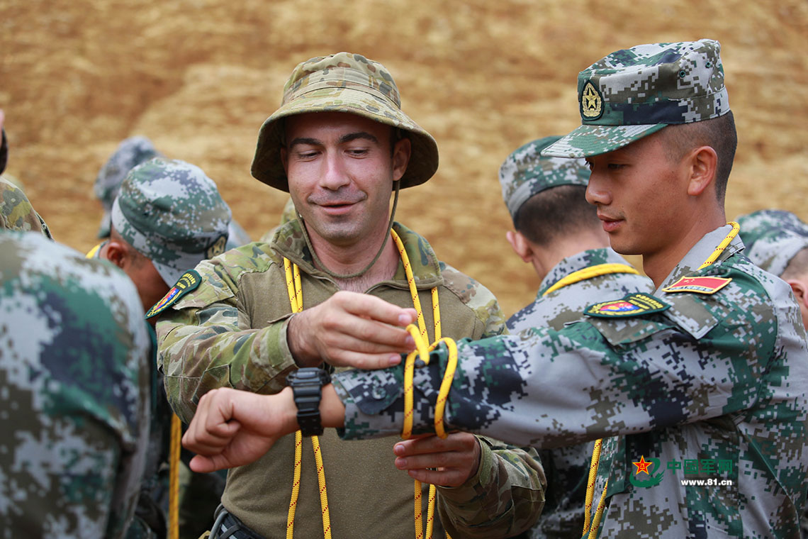 2017年9月10日至20日,“熊猫袋鼠-2017”中澳陆军联合训练在南部战区陆军昆明某综合训练场举行。这是双方队员进行结绳训练。阳吉成 摄影