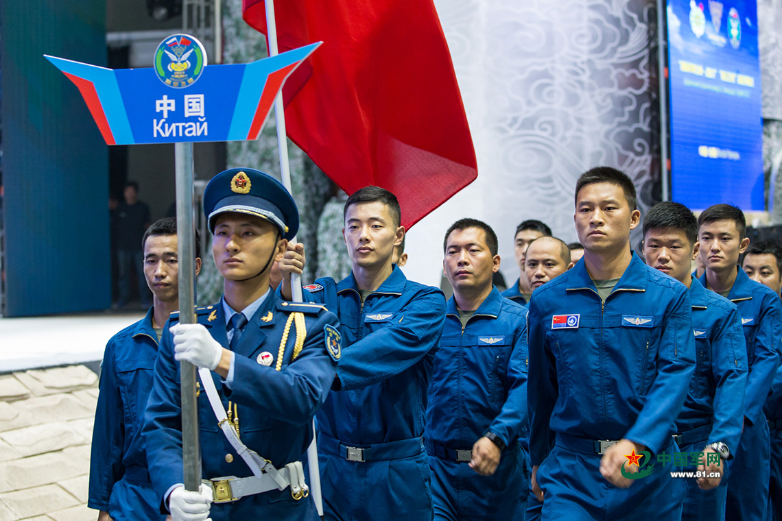 “国际军事比赛-2017”,中国吉林长春,中国空军承办的“航空飞镖”比赛开幕式,中国空军参赛飞行员代表入场。杨盼 摄影