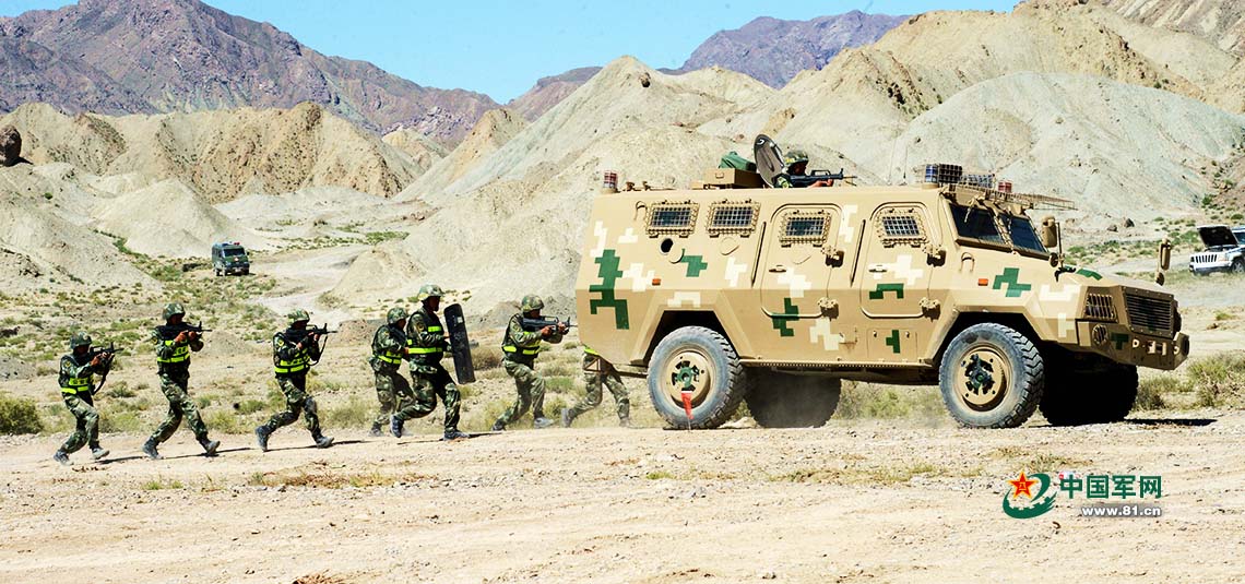 2017年6月27日,“天山-3号(2017)”联合反恐演习,在装甲车的掩护下,武警边防官兵对“暴恐分子”盘踞的营地进行突击。王小雪 摄影