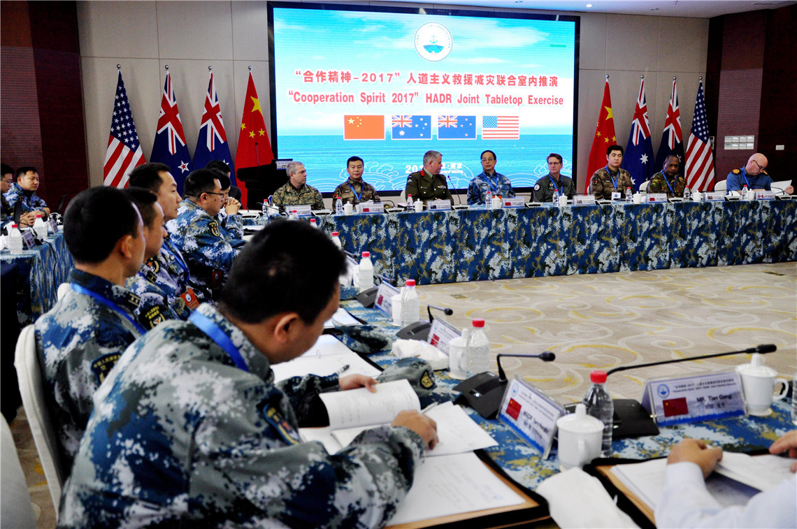 2017年12月6日,“合作精神-2017”人道主义救援减灾联合室内推演拉开帷幕。来自中国、澳大利亚、新西兰、美国的28名军地海上专业搜救人员齐聚海军指挥学院,围绕国际救援减灾行动中的指挥、协同、保障等课目展开推演。