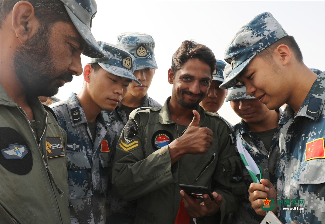 中巴空军“雄鹰-Ⅵ”联合训练落幕,两军官兵围在一起,看看双方手机中留下的影像。刘应华 摄影
