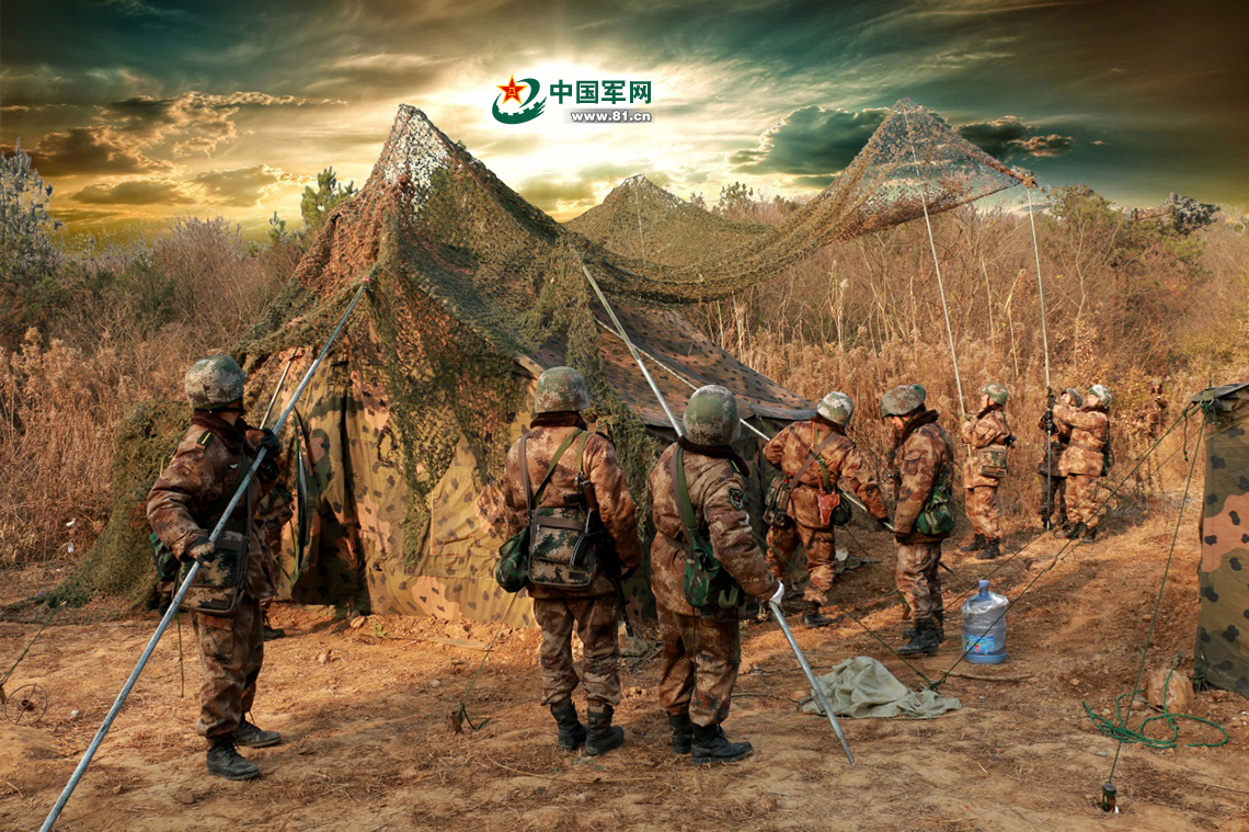 搭建帐篷完毕后,学员们进行帐篷伪装。