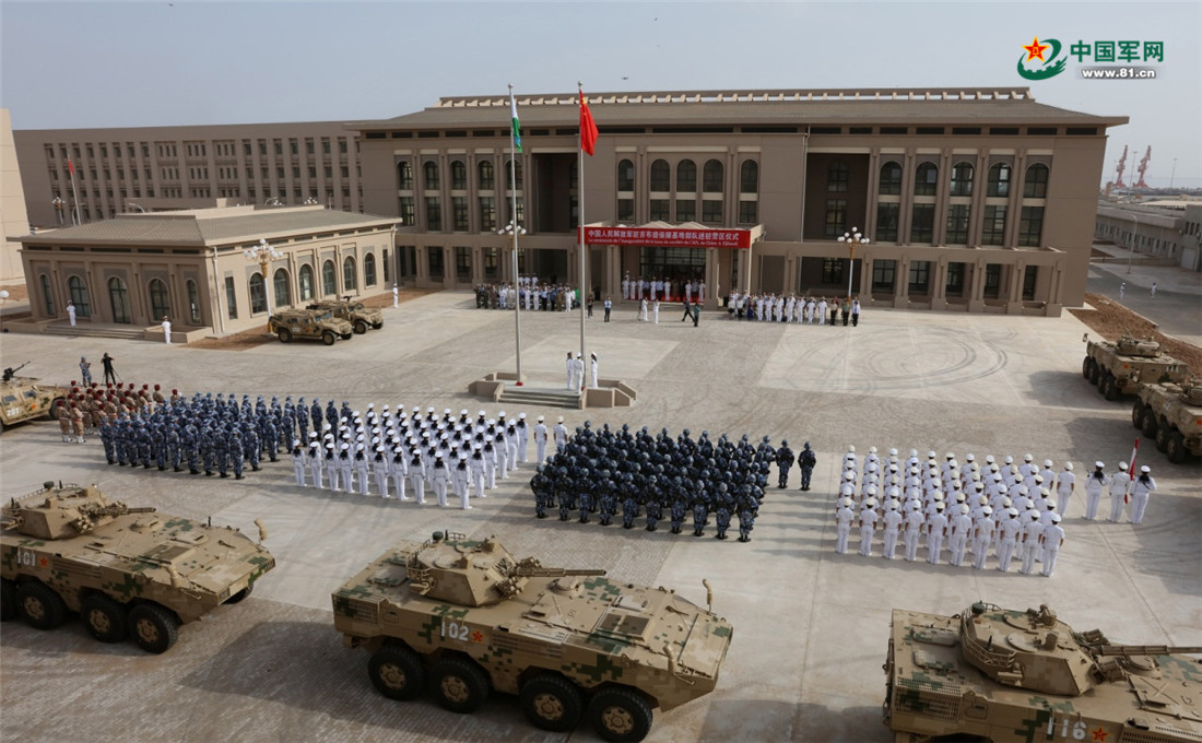 吉布提当地时间8月1日上午8时(北京时间8月1日13时),中国人民解放军驻吉布提保障基地部队进驻营区仪式在基地营区举行。图为举行升中华人民共和国国旗仪式。张庆宝 摄